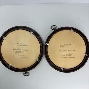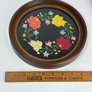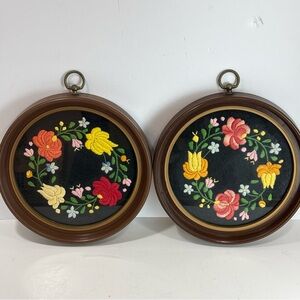 Lot Of 2 Vtg Hungarian Framed Folk Art Floral Crewel Embroidery Round Hanging 9”
