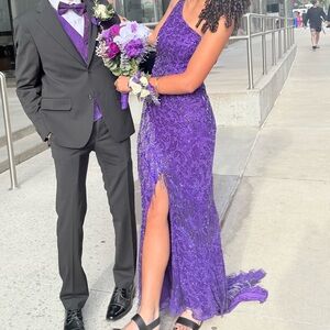 Elegant purple lace gown with one-shoulder design. Features a high slit for added style. Surprisingly comfortable. Recommend medium height, high heels so it’s easier to walk in. No smell no stains. Needs a home and a dreamy night 💜