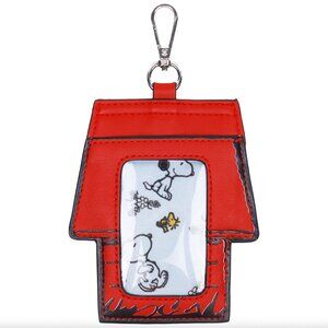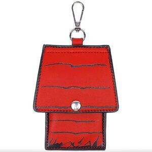 This sleek black handbag features an embossed Snoopy with his pal Woodstock and includes a bright red detachable cardholder shaped like Snoopy’s doghouse.