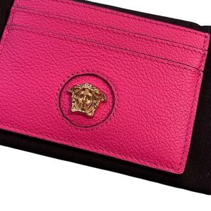 pink leather cardholder featuring the iconic gold-tone Medusa head emblem.