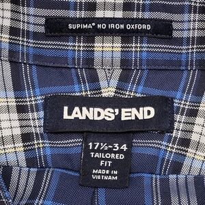 Lands End Blue Plaid Oxford Men's XL 17-1/2 34 No Iron 100% Supima Cotton LS