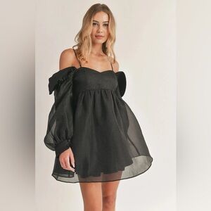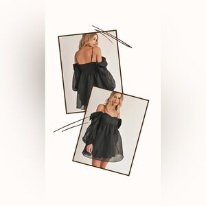 Make a romantic statement in this chic black bubble mini dress. Designed with a flirty off-shoulder neckline and delicate adjustable straps, it features sheer puff sleeves and a smocked back for the perfect fit. The flowy, flare silhouette creates a dreamy and feminine look — perfect for date nights, parties, or any occasion that calls for a little black dress with a twist.