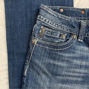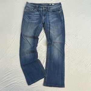 Stylish straight leg bootcut jeans by Miss Me. Classic blue hue. Perfect for casual wear.