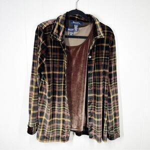 Denim & Co Brown Plaid Velvet Long Sleeve Top with Light Brown Velvet Tank M