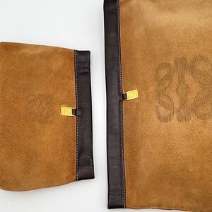 This amazing vintage clutch set by Loewe features warm brown suede with chocolate leather trim. Loewe anagram logo is embossed on exterior of each bag and both have gold tone logo tag. Hinges work on both bags. Interior is original and in great condition (the large bag has a few marks inside and is missing the interior leather tag). Very minor exterior discoloration at corners and seams consistent with age.
