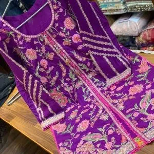 This elegant purple dress features intricate floral embroidery, perfect for any special occasion. The vibrant design adds a touch of sophistication to your wardrobe.