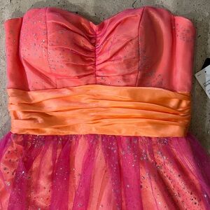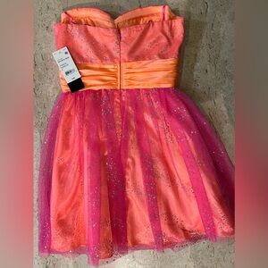 This is a vibrant fuchsia and orange party dress by MXI in size 3. The dress features a sweetheart neckline, sleeveless strapless design, and is made of polyester and tulle fabric. It has sparkles and layered accents, a fit & flare style, and a short mini length perfect for school dances, clubwear, or homecoming. Ideal for summer or spring events, it has a back zipper closure and grips on the top hem for a secure fit.