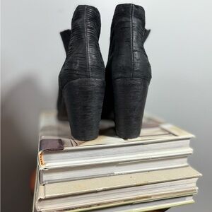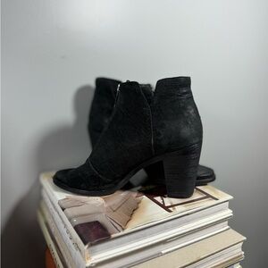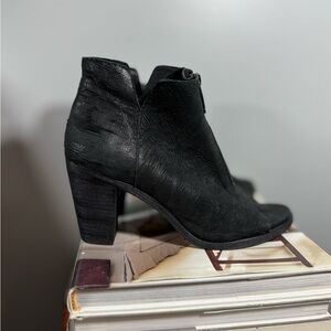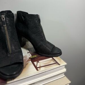 Chic black peep-toe boots with a stylish zipper. Perfect for elevating any outfit. Leather interior. Heels are 3 1/2”.