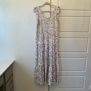 Tiered floral midi dress w/ a smocked bodice and flutter sleeves.