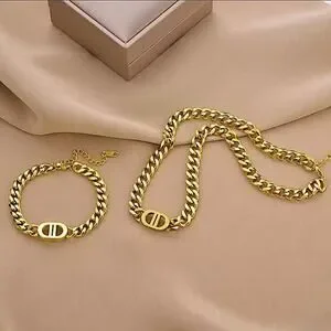 Double D Gold Plated Stainless Steel Necklace Matching Bracelet Set