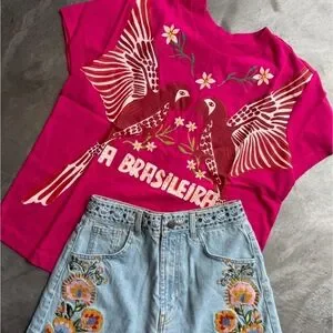 #FarmRio #GraphicTee #ParrotsPrint #TropicalStyle #ResortWear #FestivalFit #SummerWardrobe #VacationOutfit #BohoColorful #Contemporary #CottonTop