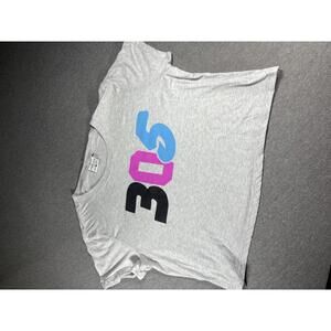 Light gray women's T-shirt featuring a bold "305" graphic in black, pink, and blue on the front.