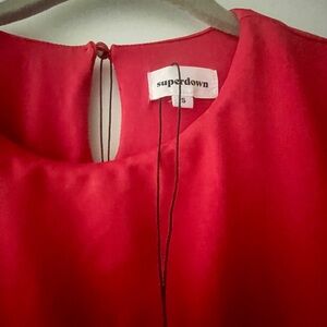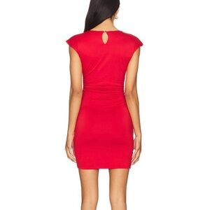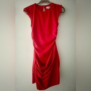 Vibrant scarlet mini dress with stylish cap sleeves. Drape ruched style. Ideal for evenings out.