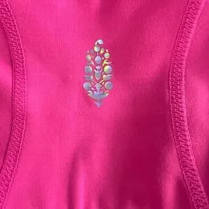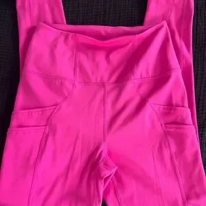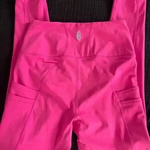 Pink leggings with double pockets on each side. They have a pocket on the inside as well. Small mark on the sizing tag. They are in great used condition.