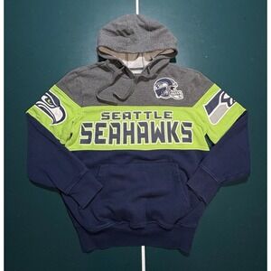 The product is a vintage Starter Seattle Seahawks hoodie sweatshirt for men in size small. This officially licensed sweatshirt features a colorblock design with embroidered logos, making it a stylish and classic choice for any fan of the Seattle Seahawks. Made with high-quality materials, this sweatshirt is perfect for showing support for the team during football season or any time of year. Whether you're at a game or just lounging around, this hoodie is a must-have for any Seahawks fan.