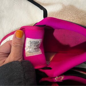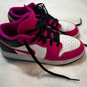 Vibrant Nike air Jordan’s in fuchsia and white. Black laces and accents. Perfect for sporty style.