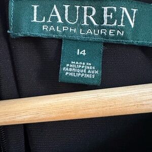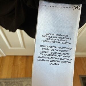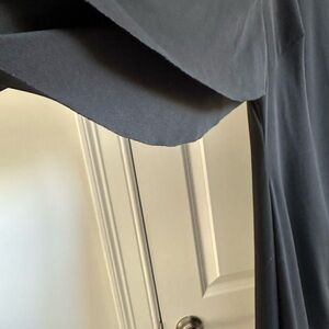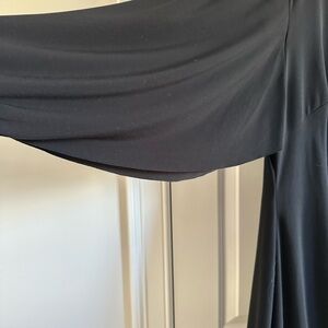 Chic black dress with long sleeves. Draped design for a sophisticated look. Perfect for formal occasions. The arms have slits under the arm. Very attractive and unique design to a little black dress.