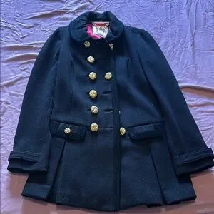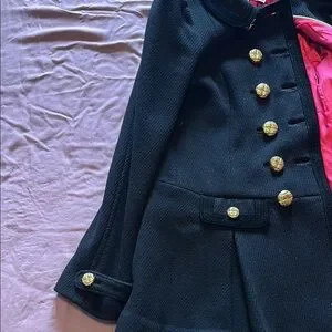 Elegant black coat with striking gold buttons. Features a classic design. Perfect for stylish outings. Good condition in smoke free home