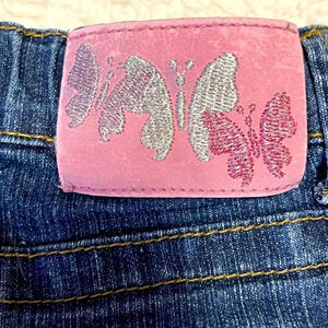 RVT Girls jean capris sequin and embroidery butterflies design. Butterflies on front and back pockets of jeans. What little girl would not like be seen in these cute jean capris with butterflies. Used side stretch for extra waist is off. But still in good condition.
