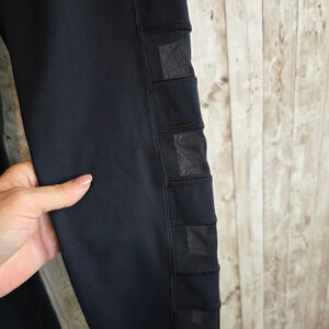 These are pre-owned black leggings, size L, by X by Gottex. The body is made of 75% nylon and 25% spandex. The trim is 85% polyester and 15% spandex. They feature a high waistband and a series of mesh squares along the outer leg. There are no visible stains, tears, or damage. The leggings appear to be in good condition.