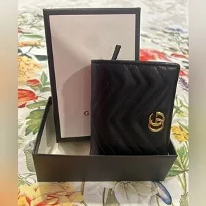 Chic black leather wallet with iconic Gucci logo. Quilted design adds texture. Ideal for stylish essentials.