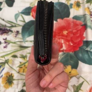 Elegant Gucci wallet in black leather. Features signature embossed pattern. Accented with red and green stripe.