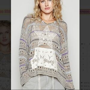 NWOT POL Boho Oversized Gray Purple Open Crochet Hoodie with Star Patch Pocket