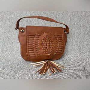 This Dolce Vita crossbody bag in a rich brown hue features a decorative woven pattern on the front, complemented by a tassel and adjustable strap. Its structured shape and supple leather offer a sophisticated yet casual look, perfect for any occasion.