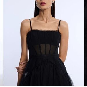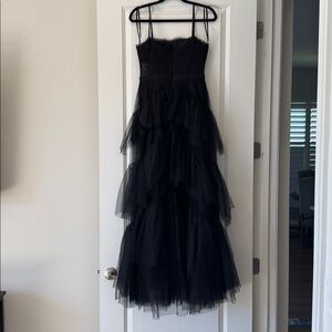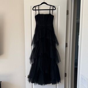 Features delicate gathering at the bust and adjustable straps for added support. The dramatic skirt is structured in sculptural tiers, creating movement and volume with every step. Finished with a hidden zip closure—ideal for black tie events or fashion-forward celebrations.