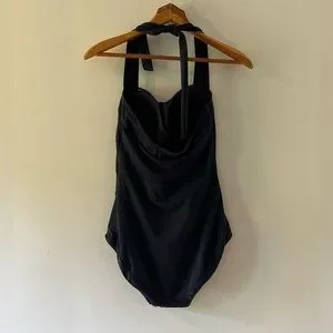 Elegant navy one-piece swimsuit. Halter neck design. Perfect for beach or pool.
