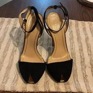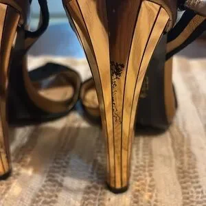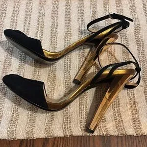 These Gucci heels showcase a refined black and gold design with minimalist straps and a sleek stiletto heel, ideal for dressy occasions. The fabric around the toes is a super soft velvet outer and a leather interior, with a sleek peep toe in front. The heel has a gold mirror paneling and stands at 4 1/2” tall.