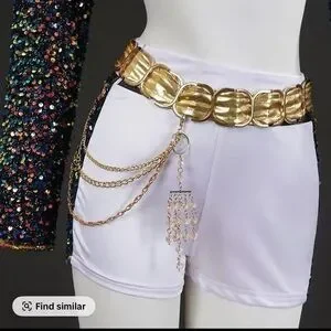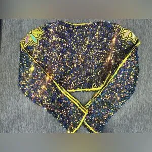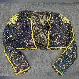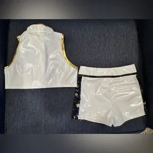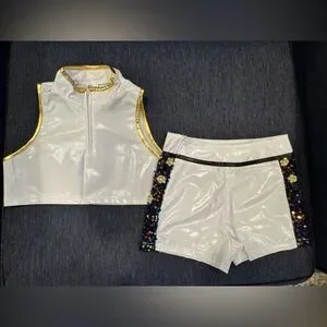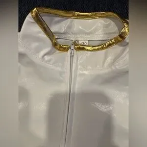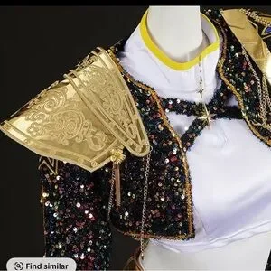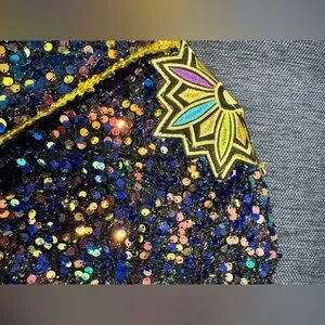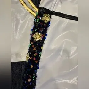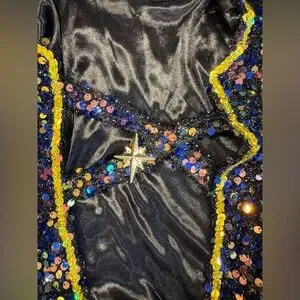 This is one of the better quality Rumi costumes I have found. details are beautiful and good quality. Sequins and chains are real not printed. Zipper closure on the side of the shorts and front of the top. “X” detail in the front of jacket is attached by Velcro for easy removal to put on.