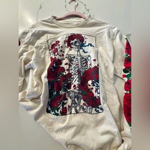 Liquid Blue Grateful Dead L/S cream double sided tee features a multicolor graphic print with a unique design of roses, woodcut wheel, and the iconic Bertha image. Made of cotton, this long sleeve tee in size M is a unisex fit and machine washable. It’s perfect for Grateful Dead fans, it’s a must have addition to any music lover's closet. With a nostalgic theme from a known high quality brand, it is a must have for those who appreciate vintage style and unique graphic prints.