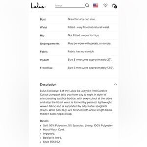 Stylish red jumpsuit with a flattering neckline and small midsection cutout. Perfect for many occasions. Perfect condition, worn once. See pictures for specs from Lulus.
