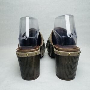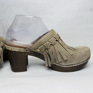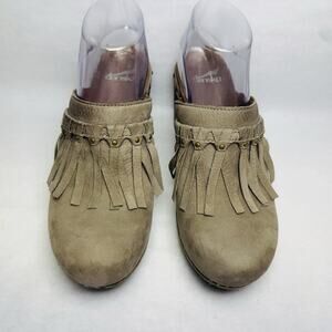 Dansko Deni Taupe Leather Fringe Studded 3” Heel Mule Clog Womens Size 38 US 8