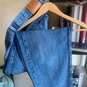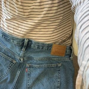 Classic Levi's straight leg jeans. Timeless blue denim. Perfect for casual wear. 14W Levis 501 button fly.