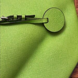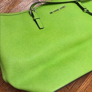 Bright lime green tote by Michael Kors. Features sleek design and ample space. Perfect for daily use. Zip closure and plenty of inside pockets for storage. Small stain on bottom as pictured. Corners look great.
