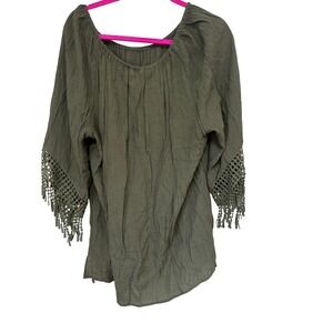Keywords: Plus size blouse, Olive green top, Crochet trim, Tassel blouse, Womens blouse, Relaxed fit, Bohemian style, EST. 1946, Size 18/20W, Tunic top, Casual blouse