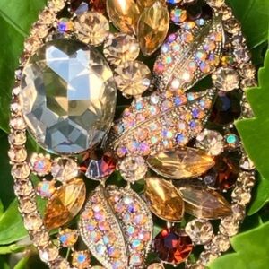 This piece looks so much like an Austrian Brooch or a Juliana but there aren’t any markings. Stunning colors is Amber and burgundy with a border of amber crystals prong set.