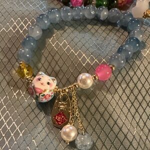 Asian beaded bracelets x3 set The cat is for good luck!Featuring vibrant pink, green, and blue beads, these accessories are perfect for any occasion.