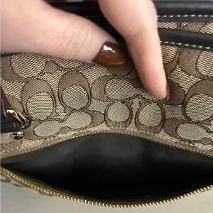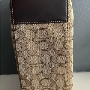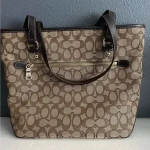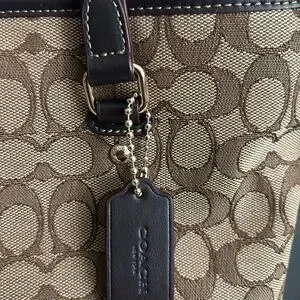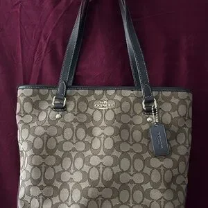 Stylish Coach tote with signature pattern. Features dual handles and iconic logo. Ideal for daily use.