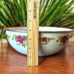 Charming vintage enamel mixing bowl by Royal Albert, featuring the beloved Old Country Roses pattern.