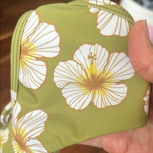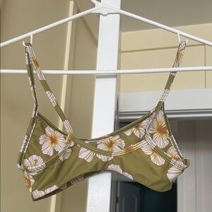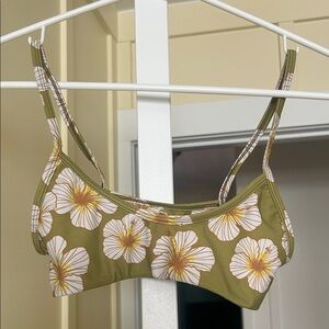 Stylish green bikini top with a vibrant floral design. Perfect for a day at the beach or pool.