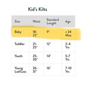 Preowned Sport Kilt Baby Kilt. Looks like new. No flaws. Hook and Loop Wrap Closure.