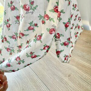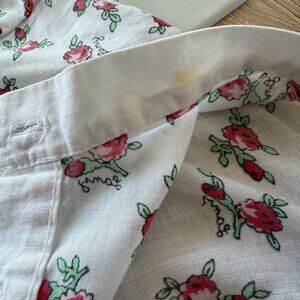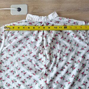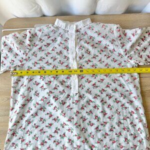 * Lightweight, mock neck, half button up night shirt in a white with red rosebud print and “Lanz” script scattered throughout.
