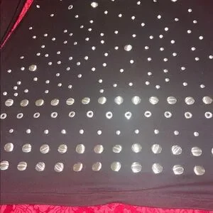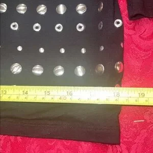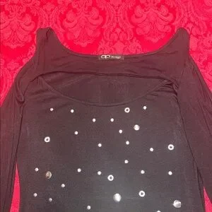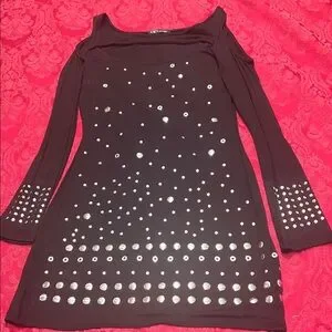 Stylish black dress featuring silver stud embellishments. Perfect for a night out. The back is just plain black. This garment has lots of stretch to it so it can fit medium to large. Smoke free environment.