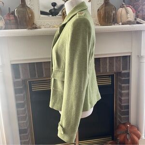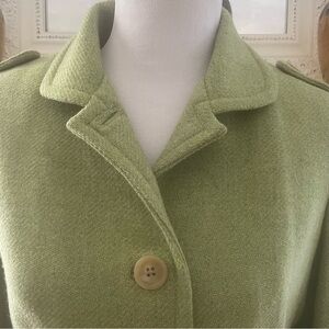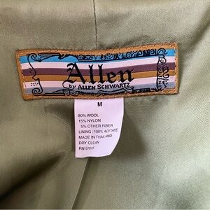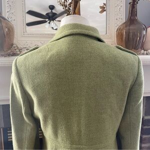 Make everyone GREEN with ENVY with this vintage ALLEN SCHWARTZ green wool military-esk blazer. The big tan buttons give this pea coat a unique 60’s vibe. The wool blend fabric provides structure and texture. Size medium.