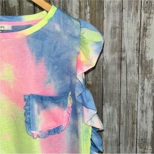 Embrace vibrant style with this colorful tie-dye top. Featuring playful ruffle sleeves and a charming pocket detail, it's perfect for adding a pop of color to your wardrobe.