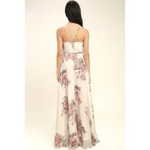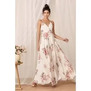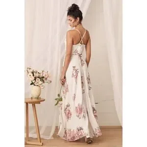 It's impossible to look anything but exquisite in the Lulus Elegantly Inclined Cream Floral Print Wrap Maxi Dress! Lovely blush pink, red, and green floral print woven chiffon falls from adjustable straps into a princess seamed, wrap bodice (with modesty snap), and a tying waist. Wrapping detail carries into the full maxi skirt.