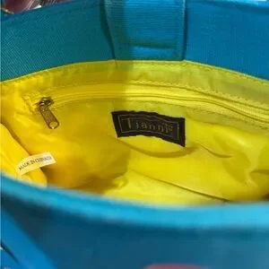 Tianni Bamboo Handle Vibrant Blue and Yellow Tote with Playful Design